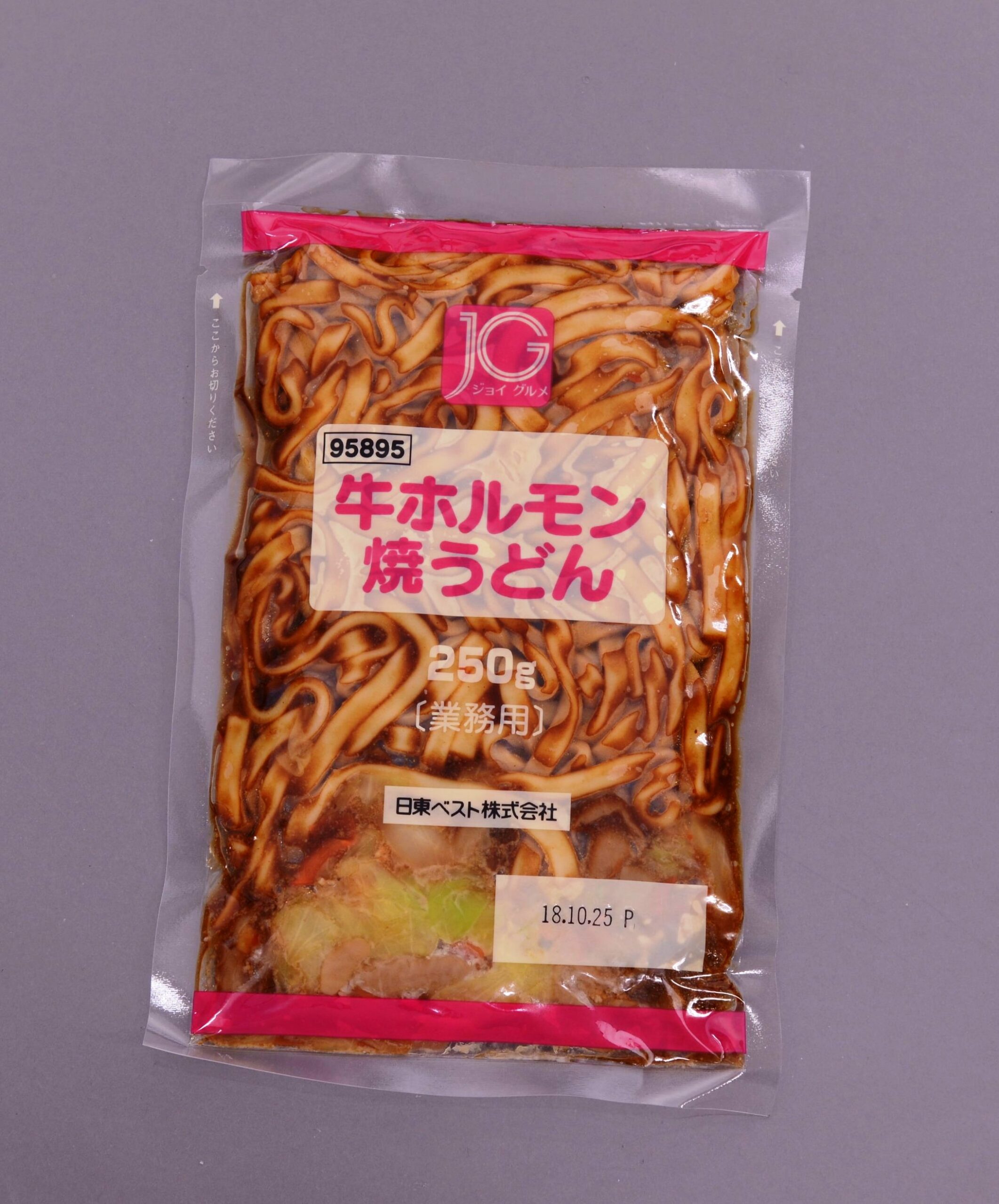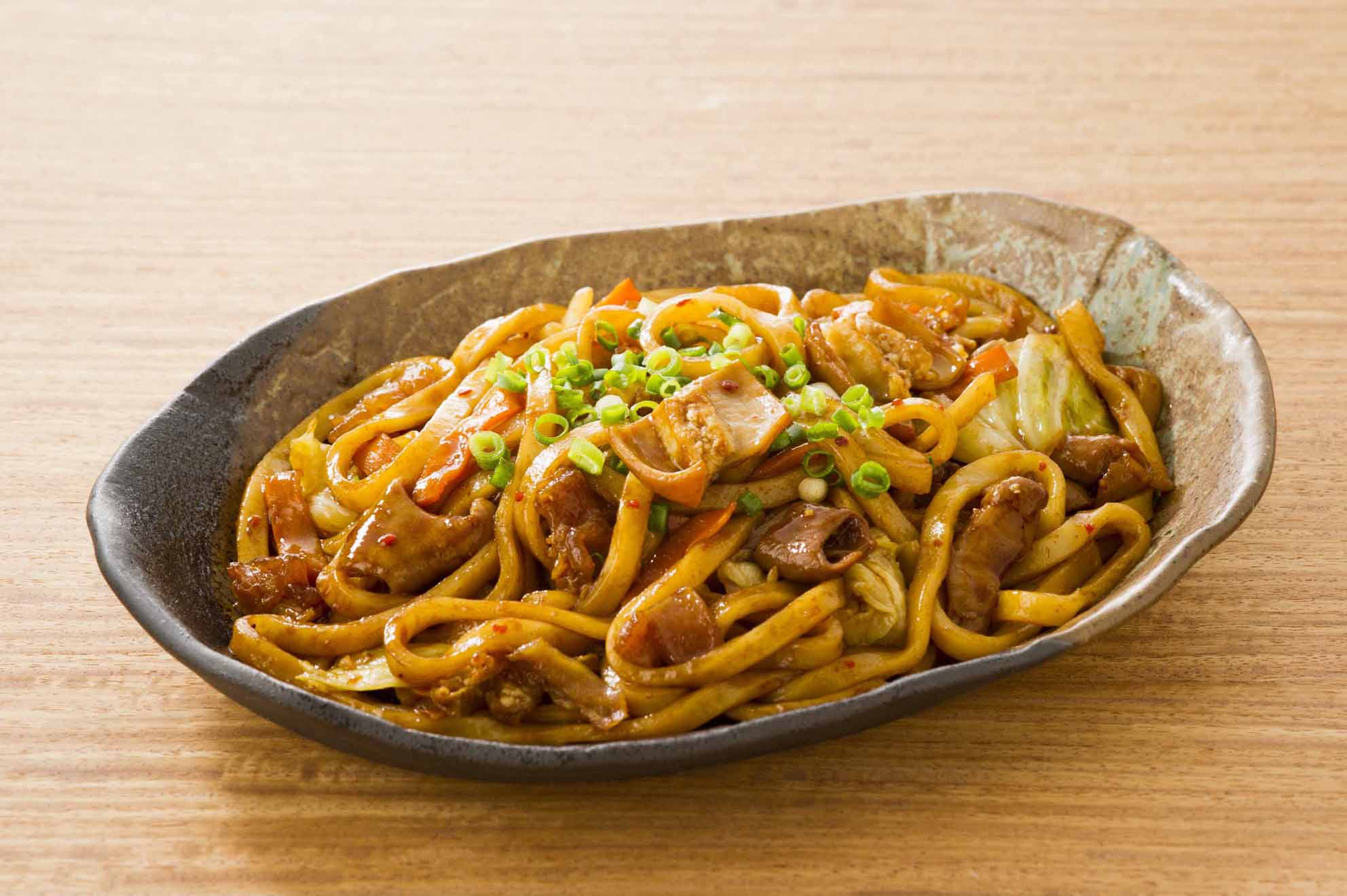 牛ホルモン(牛小腸・牛スジ)を入れた焼うどんです。焼肉のタレ味に仕上げました。
